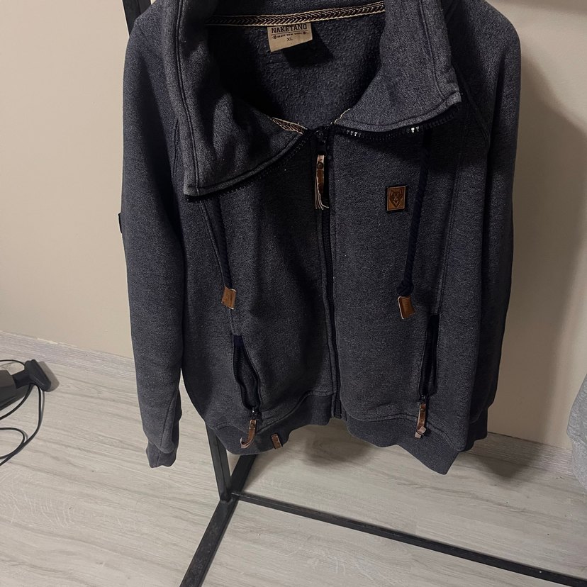 Gri renk fermuarlı erkek ceket, yumuşak ve sıcak kumaştan, rahat kesimli ve standart boyda, günlük sokak stili için uygundur.