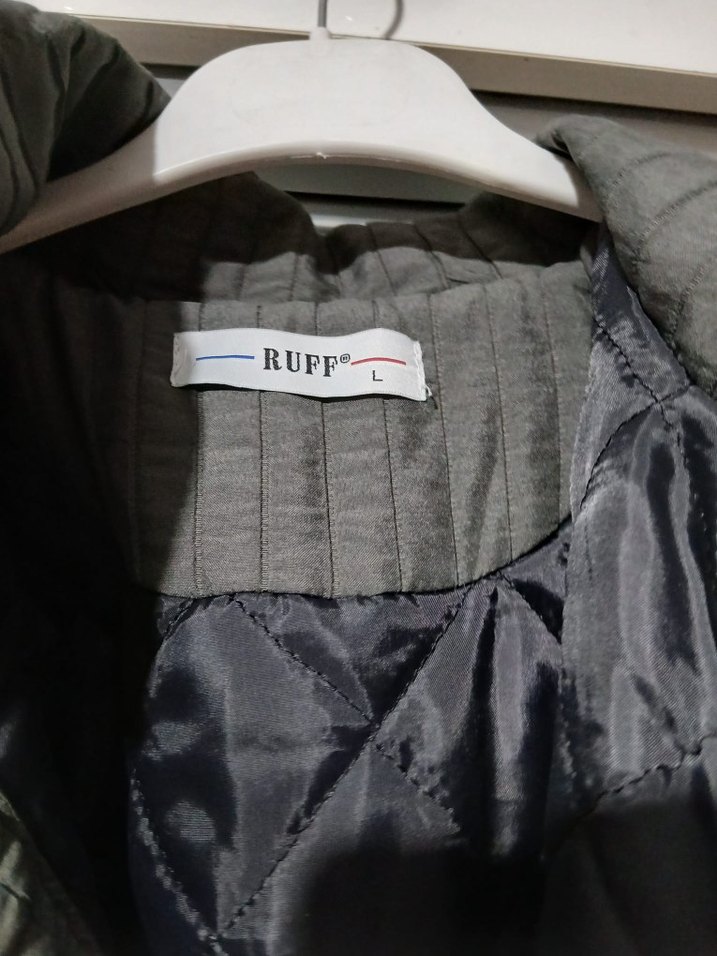 Gri keten kumaştan, fırfırlı ve kesimli yakalı erkek midi ceket. Uzun kollu ve günlük sokak stili için uygundur. Marka: RUFF°.