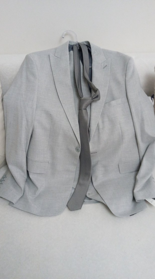 Gri erkek ceket, klasik yaka ve kemer detayına sahip. Strappy kollu, modern tarzda ve ofis kullanımına uygun. Normal boyda, desensiz ve kravatla tamamlanmıştır.