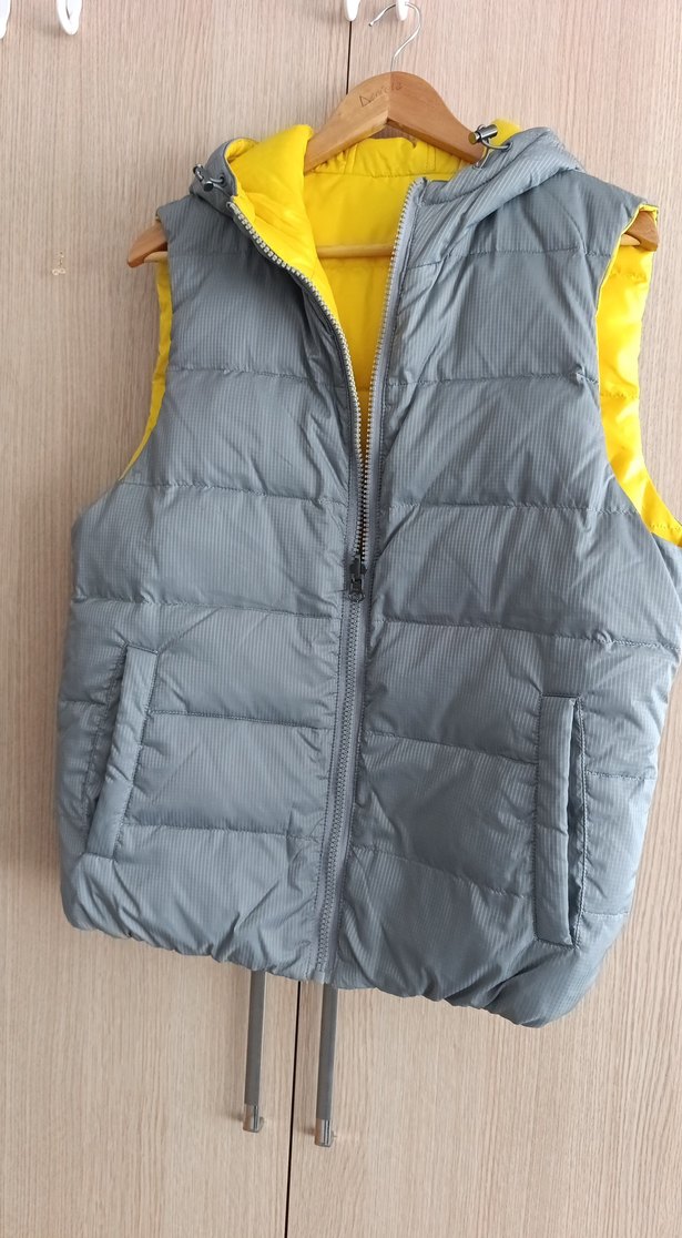 Gri renk, kapüşonlu ve fermuarlı erkek şişme yelek. kapşonlu çift taraflı İç kısmı sarı renktedir. marka temsilidir