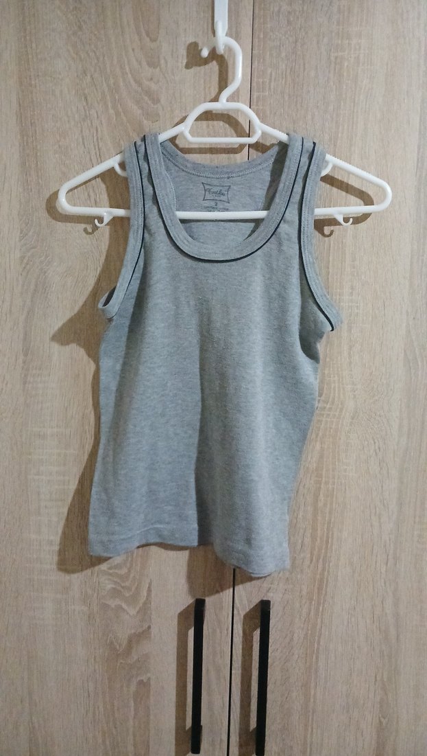 Gri renkte, desensiz ve rahat kesime sahip erkek çocuk atleti. Kolsuz ve yuvarlak yaka tasarımı vardır.
