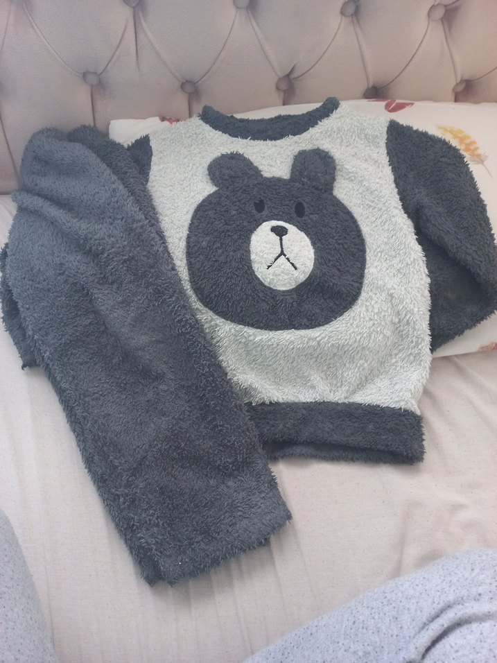 Gri renkte, yumuşak ve sıcak kumaştan yapılmış, önünde ayı figürü baskılı erkek çocuk bornoz takımı.