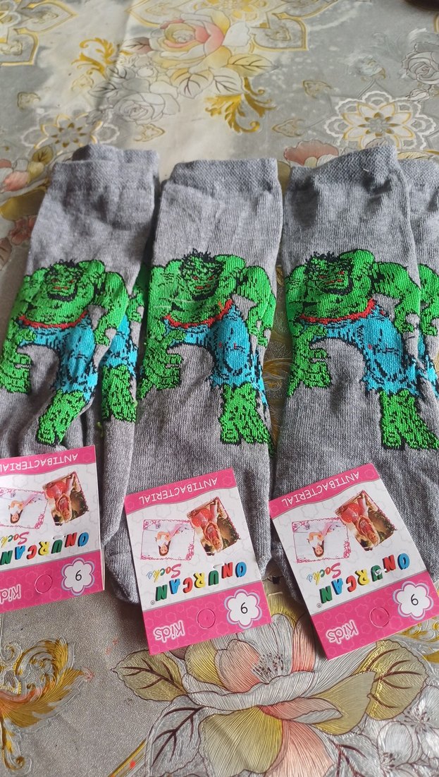 Gri renkli, yeşil Hulk baskılı erkek çocuk çorabı. 9 numara, çocuklar için uygun, eğlenceli ve canlı desenli.