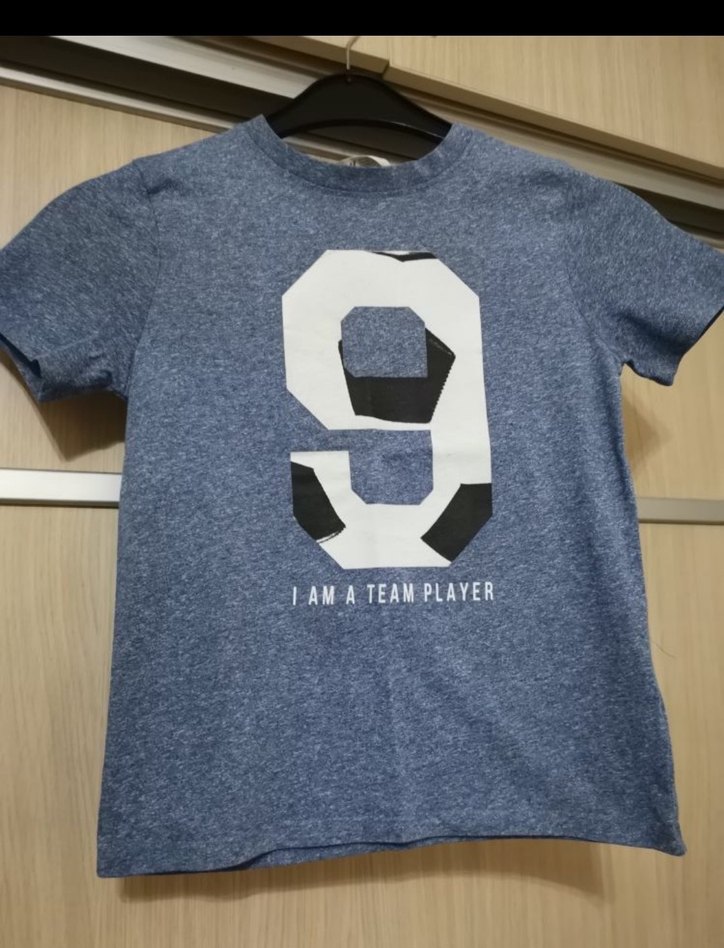 Gri renkli, denim görünümlü kumaştan yapılmış, baskılı 9 rakamı ve 'I AM A TEAM PLAYER' yazısı bulunan, kısa kollu ve dar kesim erkek çocuk tişörtü.