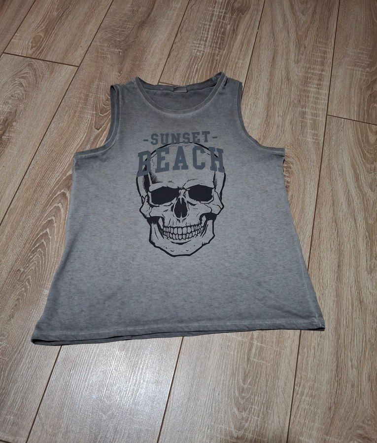 Yumuşak pamuktan,kolsuz ve yuvarlak yaka. Üzerinde 'SUNSET BEACH' yazılı kafatası baskısı bulunan rock punk tarzı tişört.Erkek çocukları hızlı büyüdüğü için 1 ay ancak giyilmiştir.Ürünün herhangi bir defosu yoktur.
