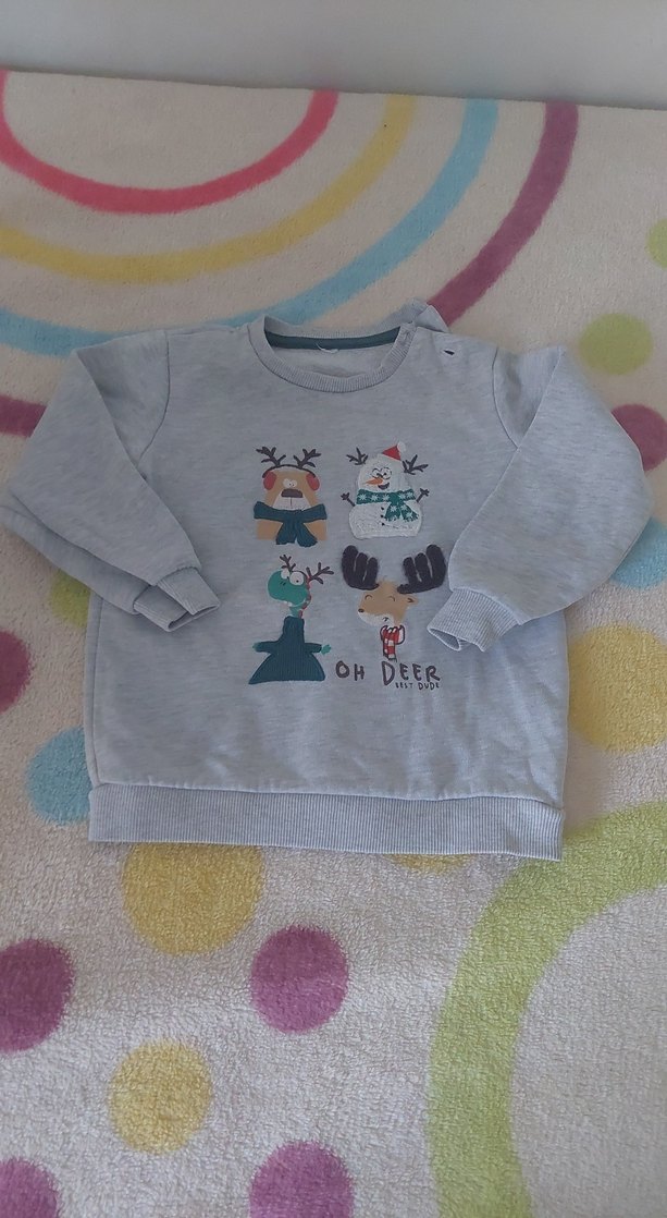 Gri renkli, yuvarlak yakalı ve uzun kollu erkek çocuk sweatshirtü. Yumuşak ve sıcak kumaştan, rahat kesim ve örgü dokusu ile. Önünde baskılı eğlenceli figürler ve "OH DEER" yazısı bulunur.