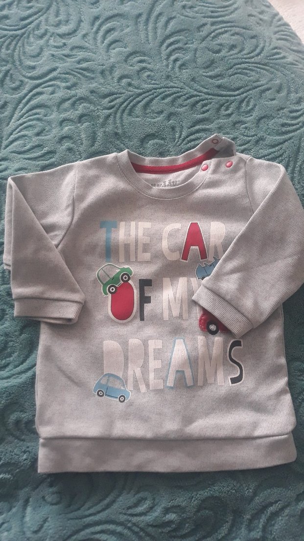 Gri renkli, uzun kollu ve yuvarlak yakalı erkek çocuk sweatshirtü. Yumuşak ve sıcak kumaştan, renkli araba baskıları ve örme detaylarla süslenmiştir.