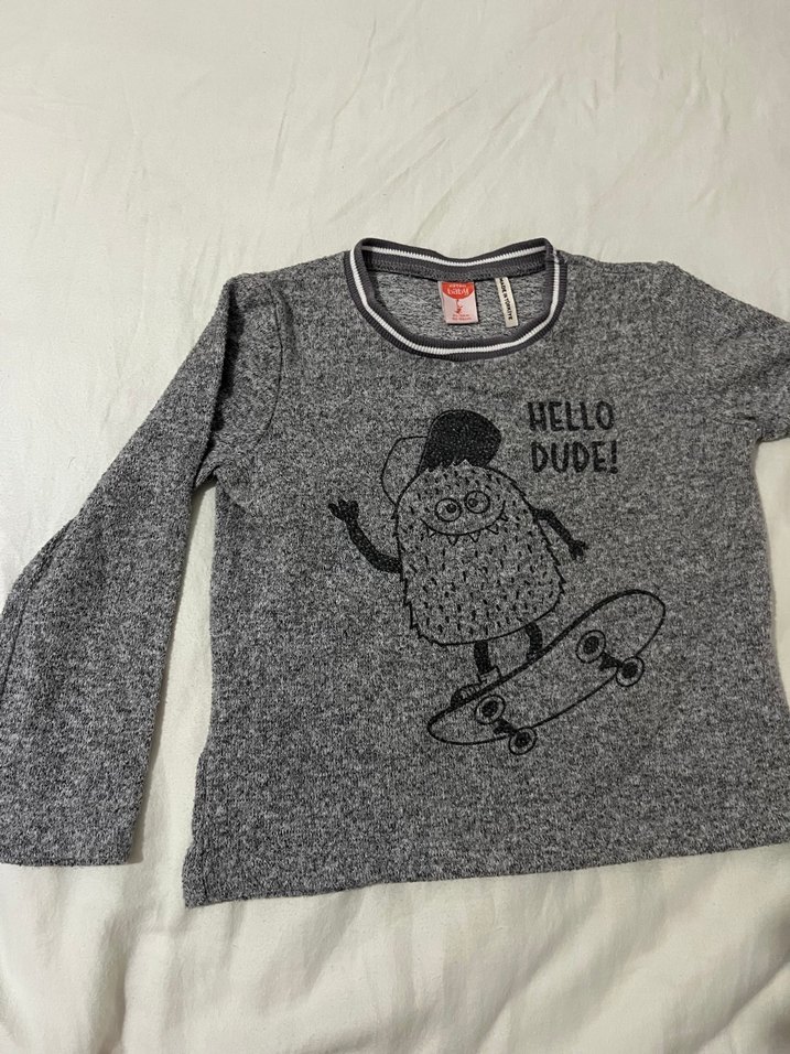 Gri renkte, uzun kollu, yuvarlak yakalı ve bol kesim erkek çocuk sweatshirtü. Yumuşak örme kumaştan yapılmış, 'HELLO DUDE!' yazılı ve kaykay yapan karakter baskılıdır. Sokak tarzı ve rock punk havasında.