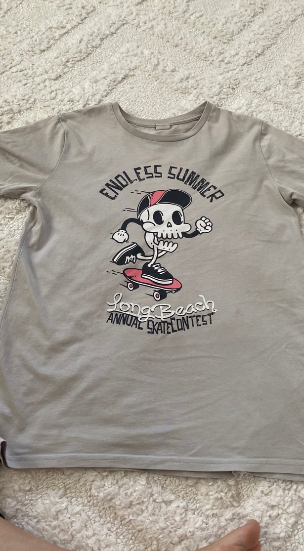 Gri renkli, pamuklu kumaştan yapılmış, bol kesim kısa kollu ve yuvarlak yaka erkek çocuk tişörtü. Kaykay yapan kafatası baskısı ile rock punk havası taşıyor.