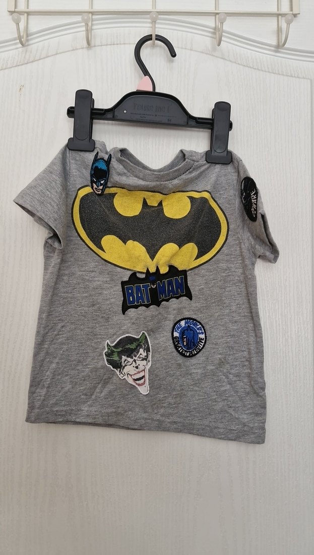 Gri renkli, dar kesim erkek çocuk tişörtü, kısa kollu ve bisiklet yaka. Batman ve Joker baskıları ile süslenmiş, düğmeli detaylar içerir.
