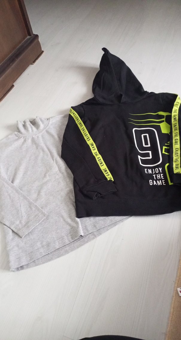siyah sweatshirt boy 52 cm beden 38 Gri badi boy 49 cm beden 36 esnektir yakasında leke var bariz değildir , rahat kesim. siyah sweatshirt kapşonlu Üzerinde yazılı baskı bulunur. 7 yaş uygun olacaktır