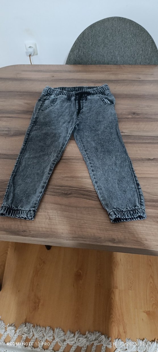 Gri renk bol kesim erkek çocuk denim pantolon, elastik bel ve paça detaylı, rahat ve trend sokak stili için uygundur.