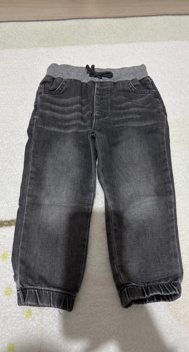 Gri renkte, bol kesim, pamuklu denim kumaştan yapılmış erkek çocuk pantolonu. Kemer tokalı ve lastikli paçaları vardır, desensiz sade tasarım sunar.