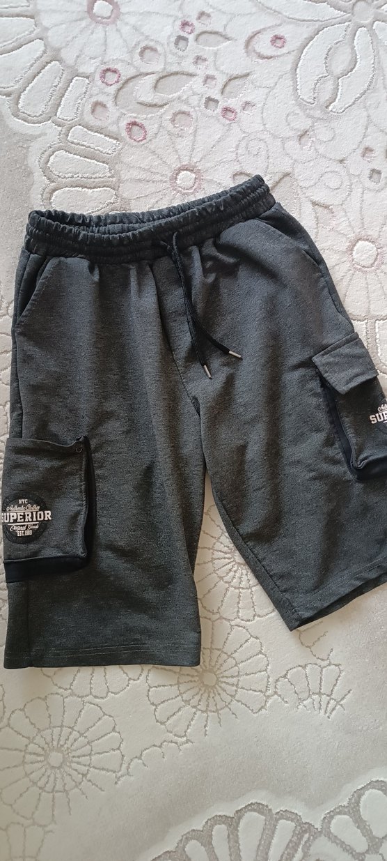 Yumuşak ve sıcak kumaştan, bel kemerli gri erkek çocuk bol kesim kargo şort. Yan cepler ve 'IPERIOR' logosu bulunur.