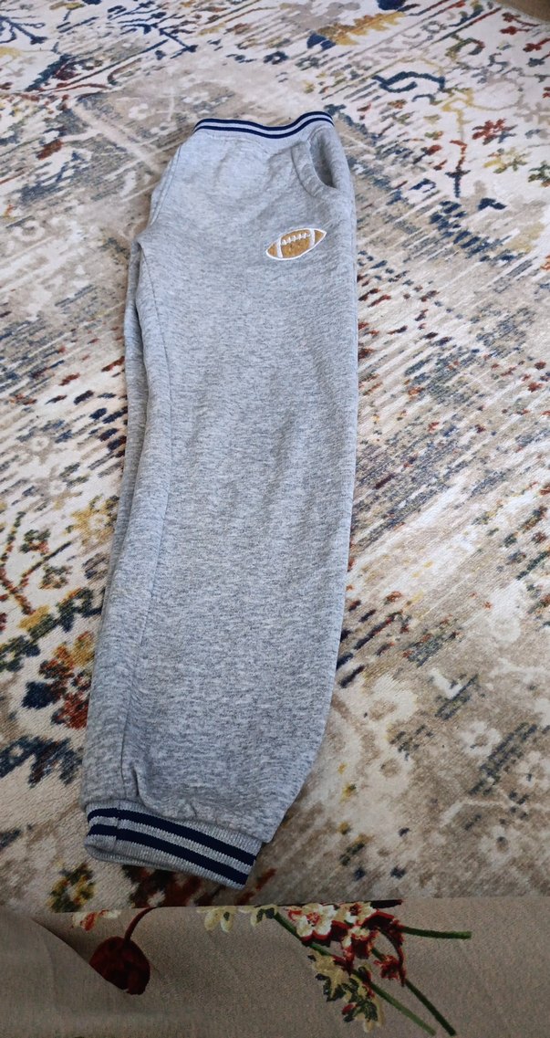 Gri renk, bol kesim erkek çocuk sweatpants. Yumuşak ve sıcak kumaştan, kürk detaylı, sokak stili için uygun.