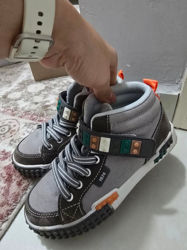 Gri renkte, , kauçuk tabanlı ve kemerli erkek çocuk botu snekar sokak tarzına uygun. 1 kere giyildi çok iyi durumda.
