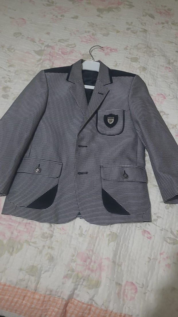 Gri renkli, notched lapel yaka ve düğmeli ön kapamalı çocuk ceketi. Uzun kollu, baskılı desenli ve regular fit kesimle trend sokak stili için uygundur. mezuniyette bikere giyildi