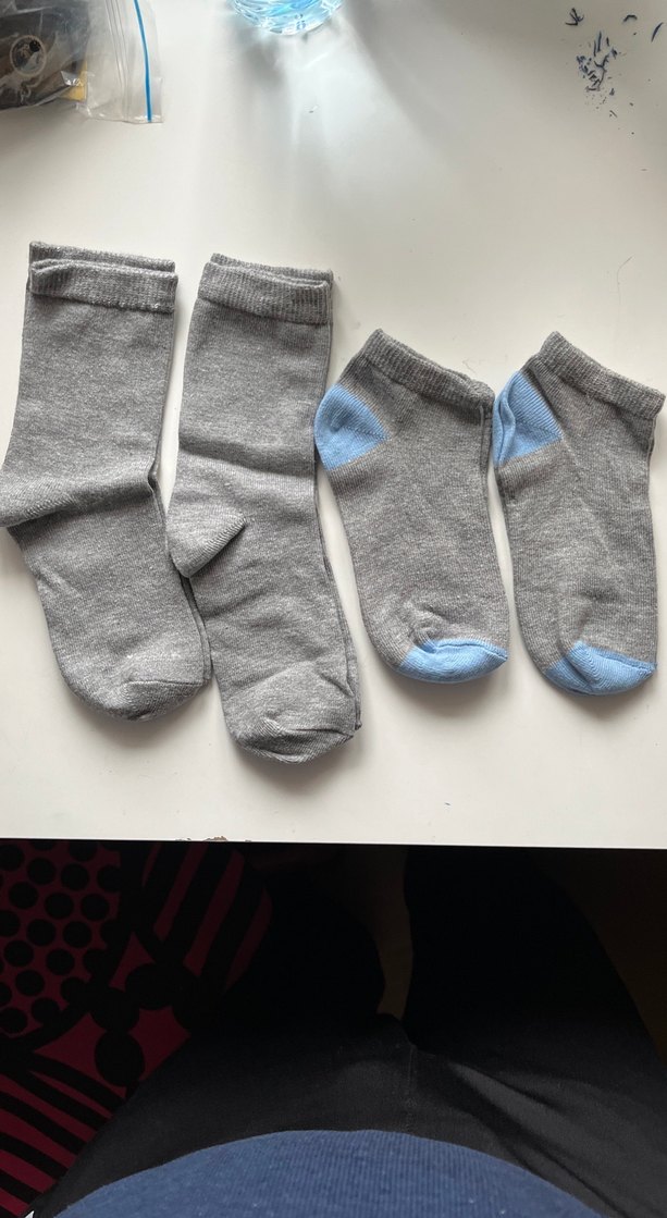 Gri renkte, biri düz diğeri topuk ve burun kısmı açık mavi detaylı iki çift erkek çocuk çorabı. Rahat ve sade tasarım.