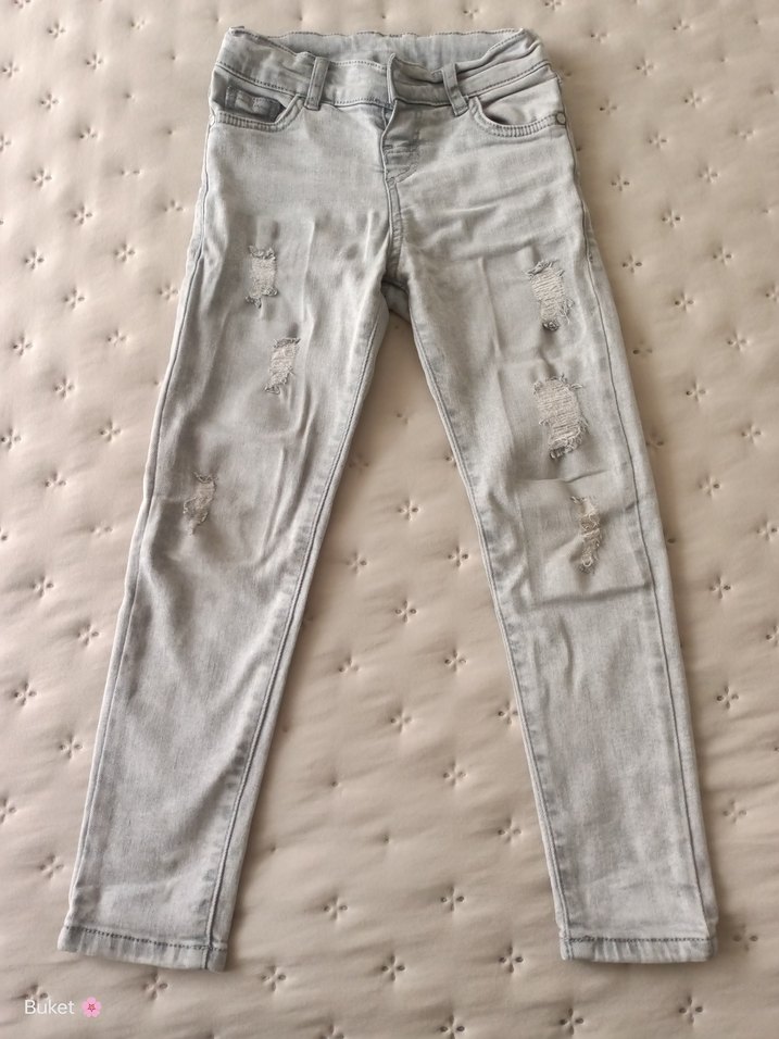 Gri renkte, dar kesim erkek çocuk denim pantolon. Düğmeli ve desen içermeyen, yıpratma detaylı sade tasarım. Rahat ve trend bir görünüm.Fazla kullanılmadı temiz.