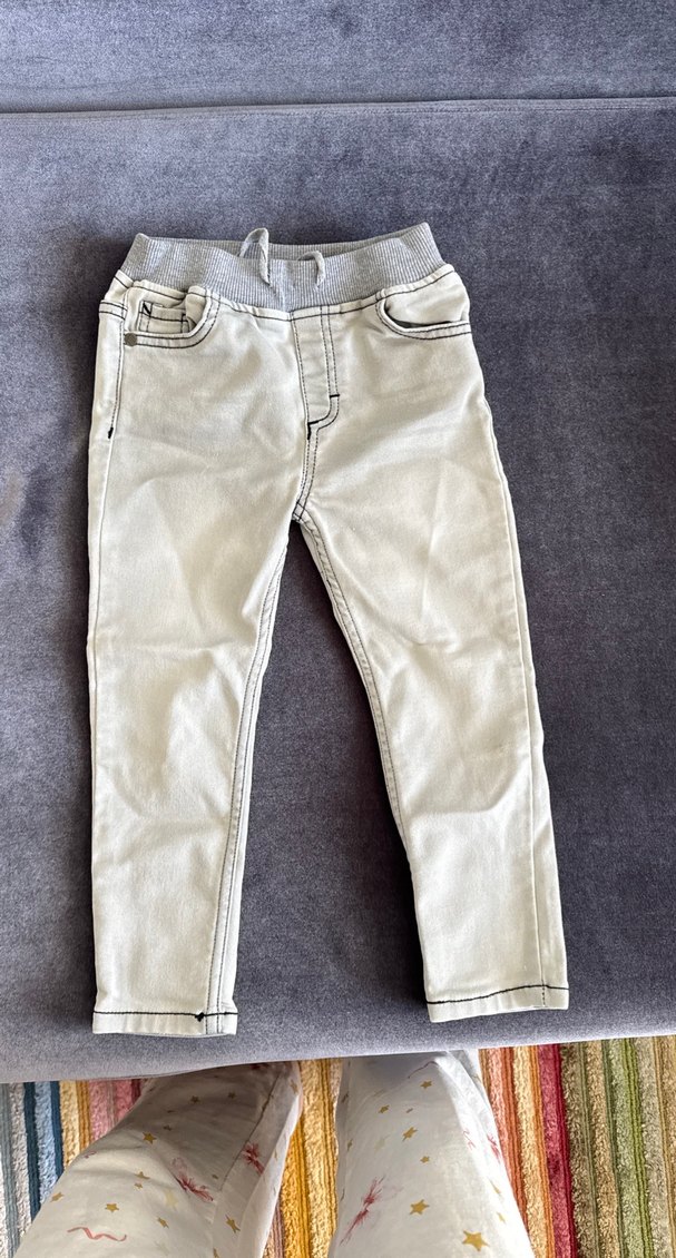 Erkek çocuklar için dar kesim gri kot pantolon, düğmeli ve rahat lastikli bel detayına sahiptir, sokak stili için uygundur.