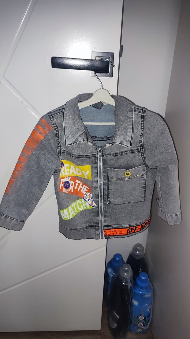Erkek çocuklar için gri, oturan kesim denim ceket, kesik yaka, düğmeli cep ve renkli baskılarla "READY FOR THE MATCH" yazılı.