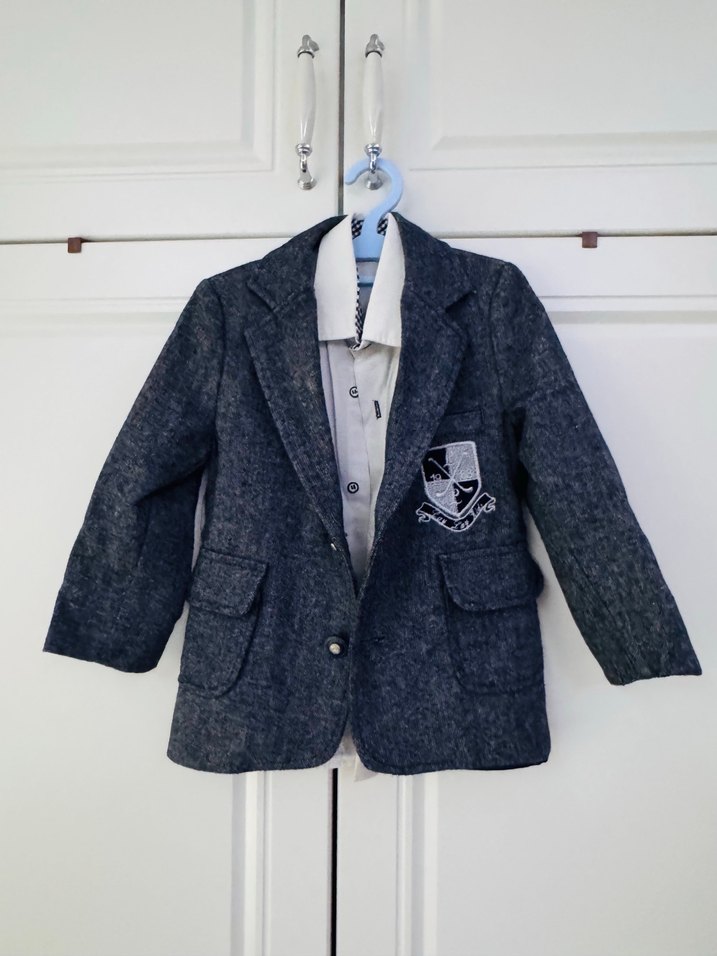 Gri renkte, düğmeli ve klasik yaka detaylı erkek çocuk denim ceketi. Rahat kesimiyle günlük şıklık sunar.