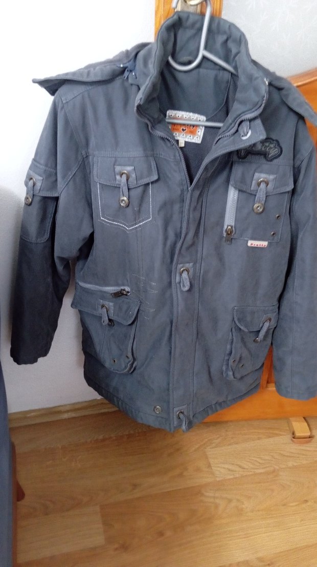 Gri renk, düğmeli cepler ve baskılı detaylara sahip erkek çocuk denim ceket, rahat kesim ve kesik yaka ile sokak tarzı sunar.