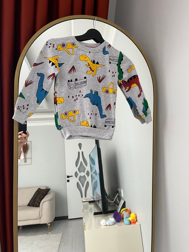 Gri renkli, uzun kollu ve rahat kesim dinozor desenli erkek çocuk sweatshirtü. Yumuşak örme kumaştan yapılmıştır ve sokak tarzına uygundur.