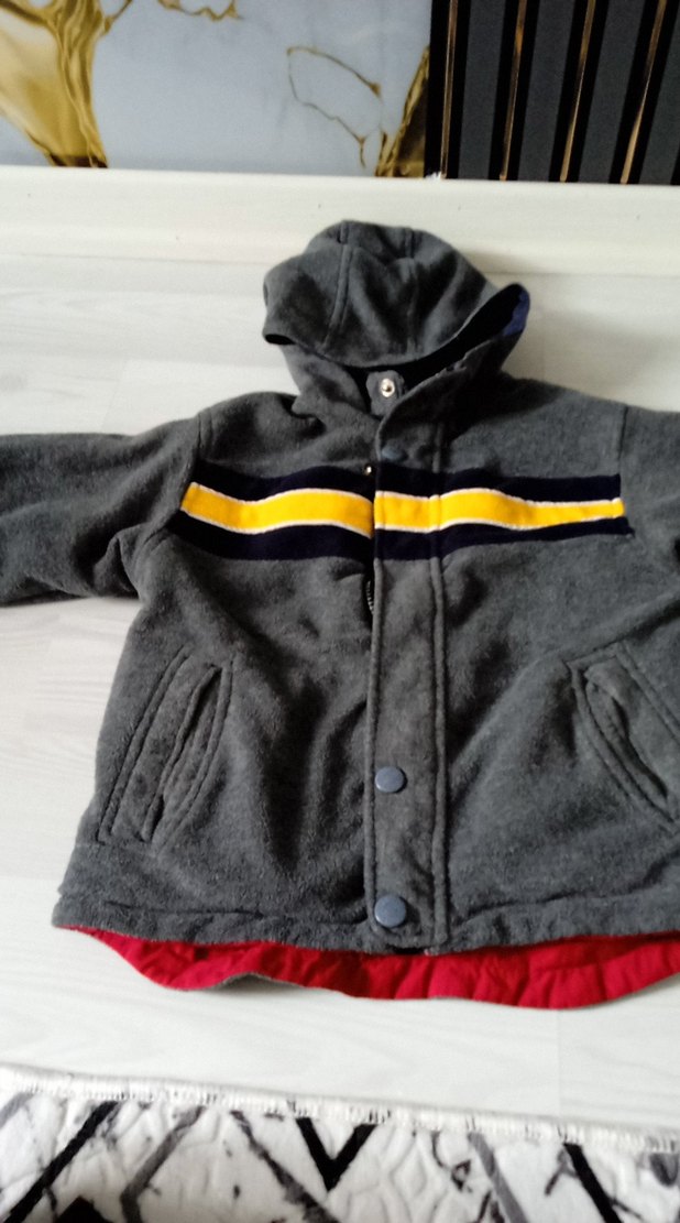 Gri renkli, düğmeli ve cepli erkek çocuk polar ceketi. Sarı ve siyah şerit detaylı, rahat kesim ve yakası notched lapel tarzında.