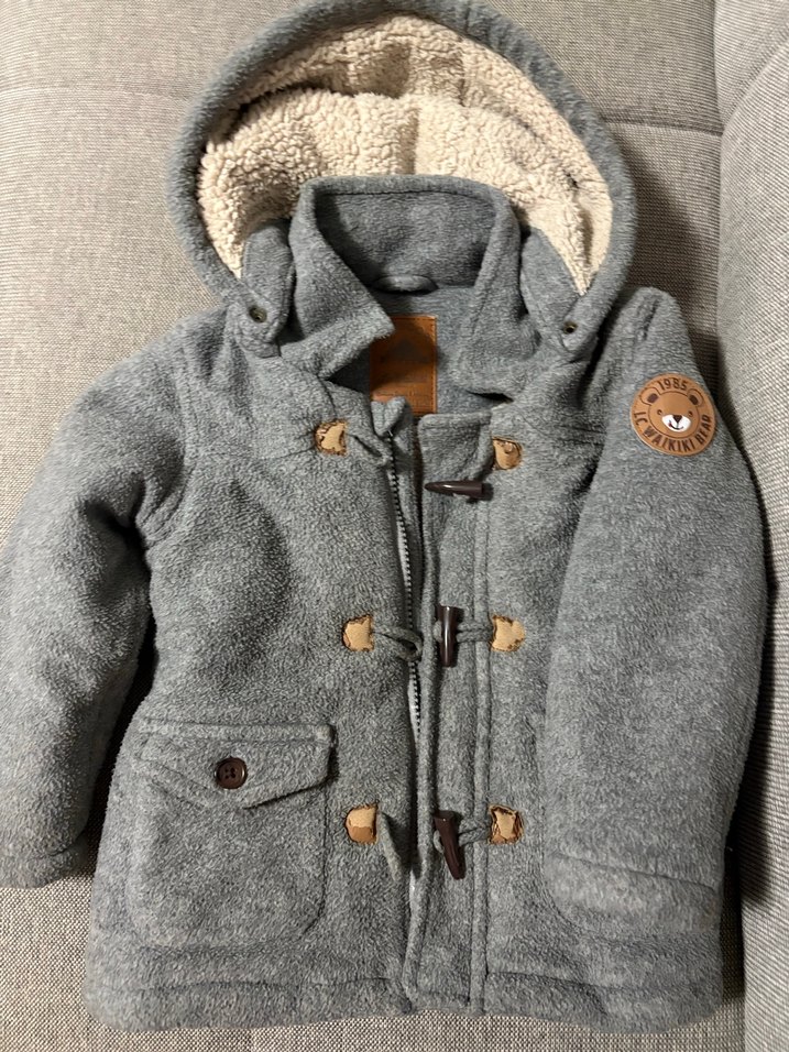 Gri renkli, düğmeli, yumuşak polar kumaştan yapılmış, kapüşonlu ve sherpa astarlı erkek çocuk montu. Notch yaka ve sade tasarımıyla günlük kullanıma uygun. 3 yaş uyumlu, düğme yerlerinde soyulmalar var. Başka herhangi bir problemi yok.