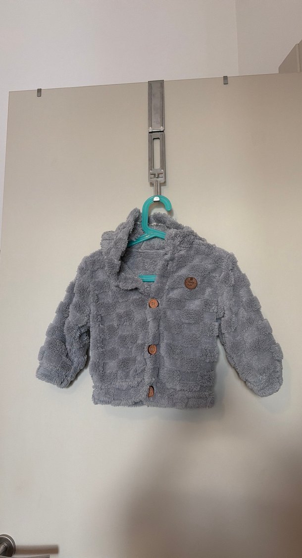 Düğmeli, gri renkli, yumuşak ve sıcak kumaştan üretilmiş, rahat kesimli erkek çocuk montu. Notlu yakası ve batik deseniyle dikkat çeker.
