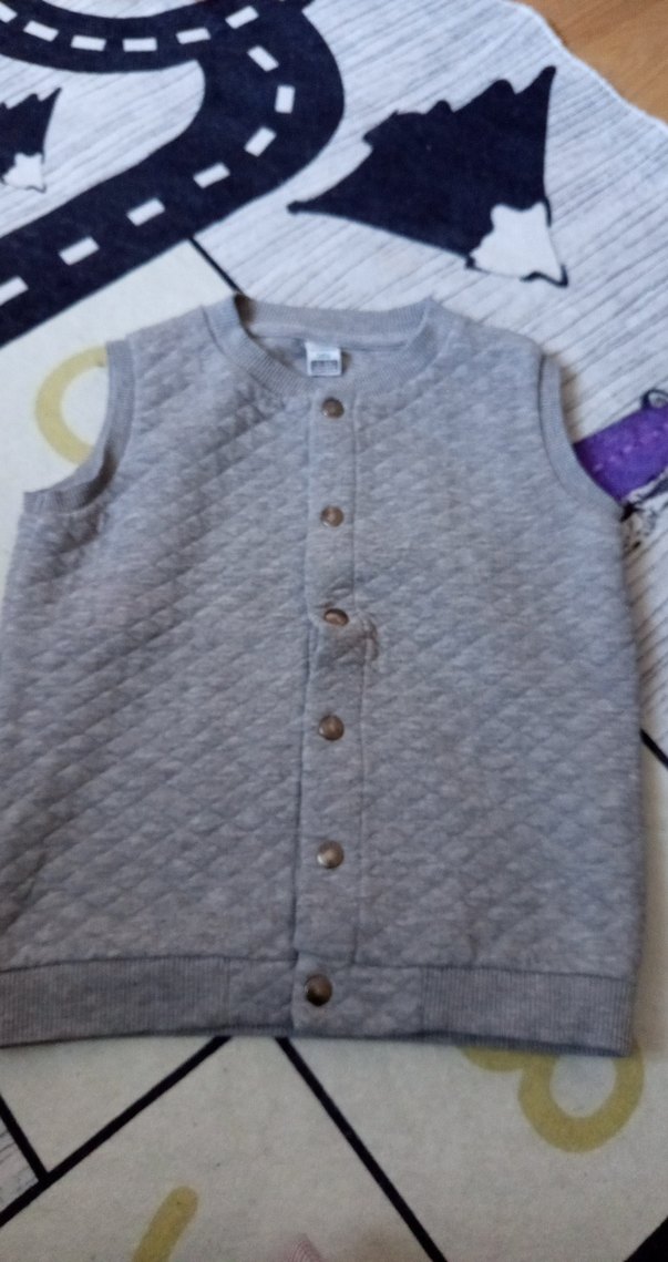 Düğmeli ön kısmı, kolsuz yapısı ve yuvarlak yakası ile gri erkek çocuk süveter. Triko kumaştan, düz ve rahat kesimlidir.