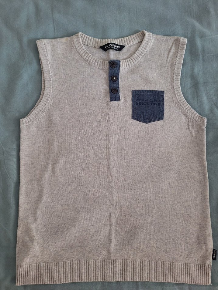 Gri triko kumaştan, düğmeli ve bisiklet yaka erkek çocuk yeleği. Mavi küçük cep ve rahat kesimiyle günlük sokak stili için uygundur.
