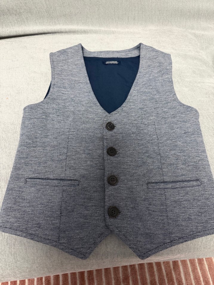 Düğmeli, kolsuz ve kesik yakalı bu erkek çocuk yeleği, yumuşak sentetik kumaştan üretilmiş ve rahat bir kesime sahiptir. Gri ve desensiz tasarımıyla trend görünüme uygundur.