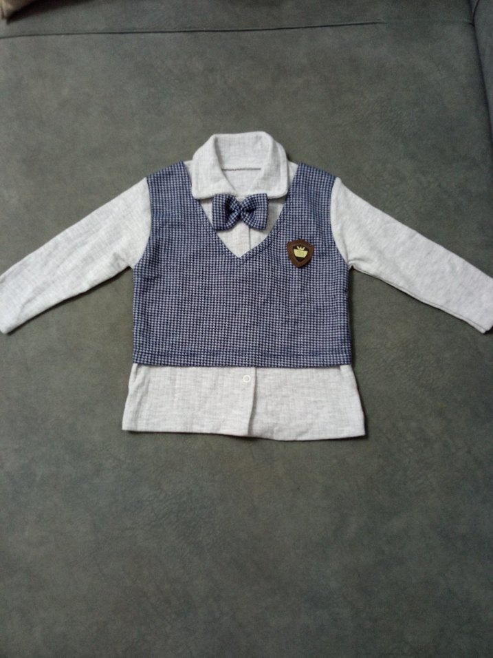 Gri renkte, düğmeli, notched lapel yaka ve baskılı yelek detaylı uzun kollu erkek Bebek kazağı. Rahat kesim ve fiyonk süsü içerir.