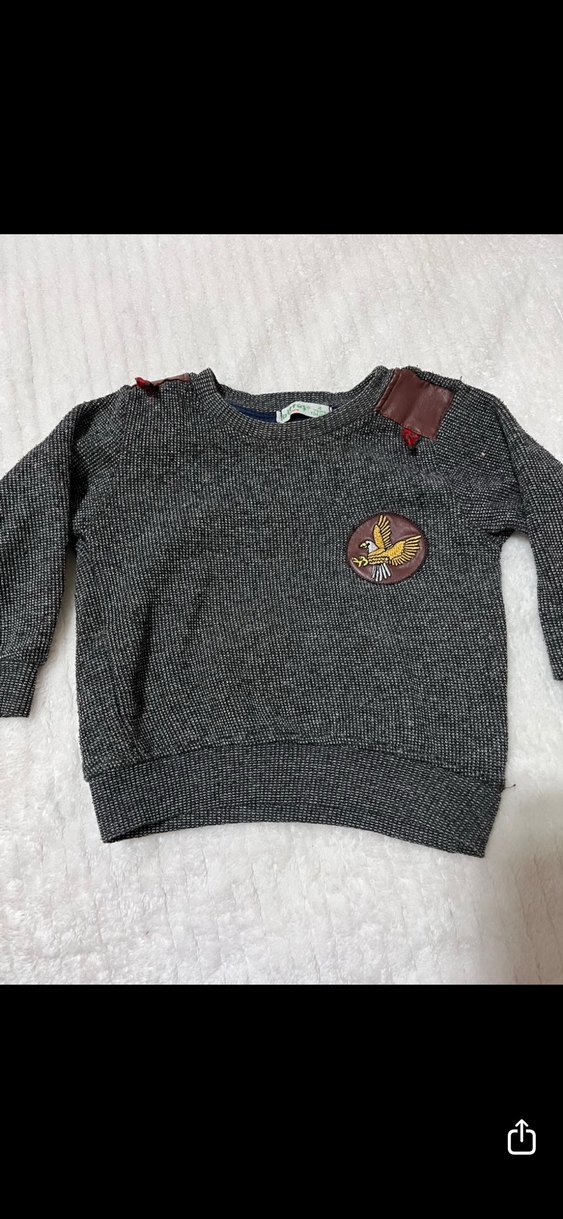 Gri renkte, uzun kollu, yuvarlak yakalı ve bol kesim erkek çocuk sweatshirtü. Yumuşak yün kumaştan üretilmiş, düğme detayları ve nakışlı desen içerir.