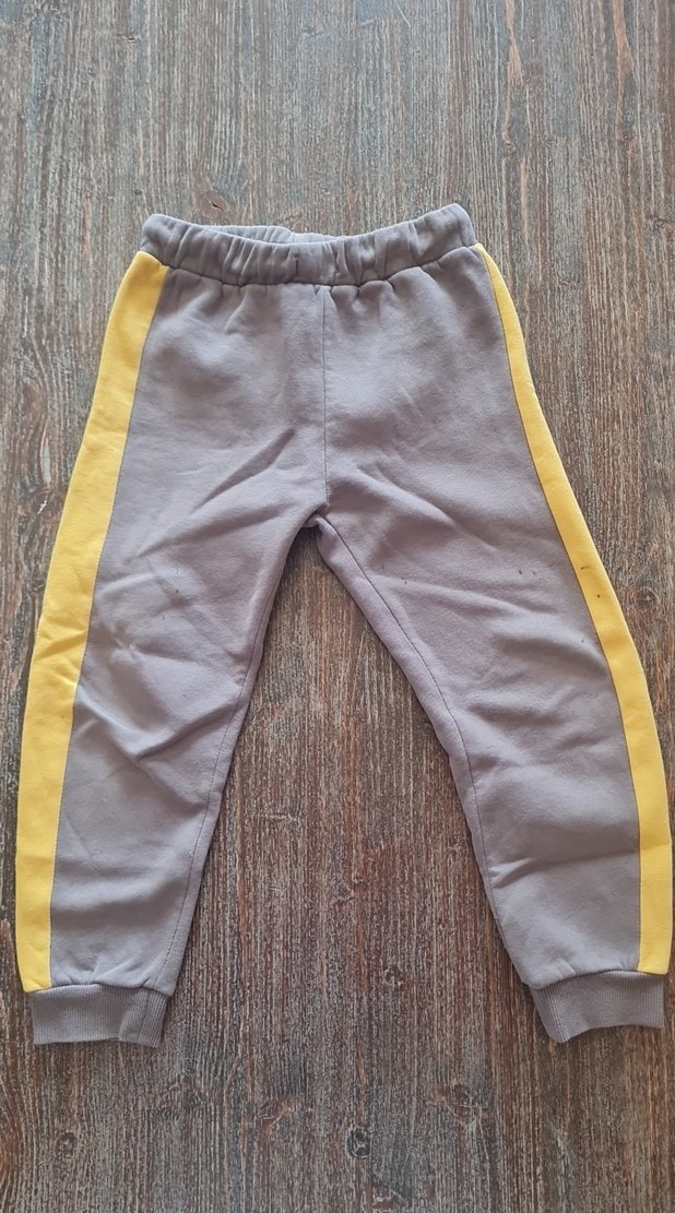 Gri renkte, elastik bel ve paça uçlu erkek çocuk eşofman altı. Yumuşak kumaştan, sarı yan şerit detayıyla sokak tarzına uygun.