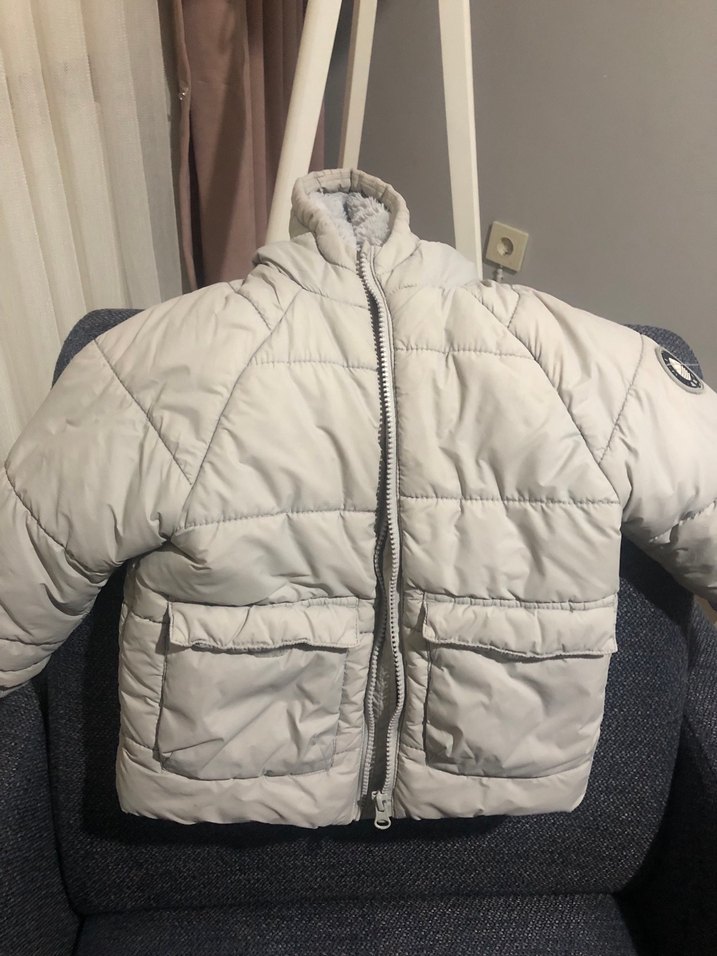 Gri renkte, fermuarlı ve kesik yaka detayı olan, yumuşak ve sıcak kumaştan yapılmış, sade sokak stili erkek çocuk kabanı.