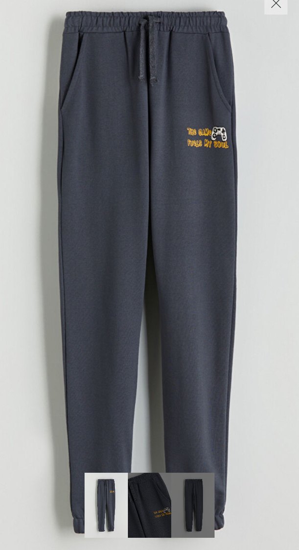 Gri renkli, baskılı ve fermuarlı cepleri olan, yumuşak ve rahat kumaştan üretilmiş bol kesim erkek çocuk sweatpants.