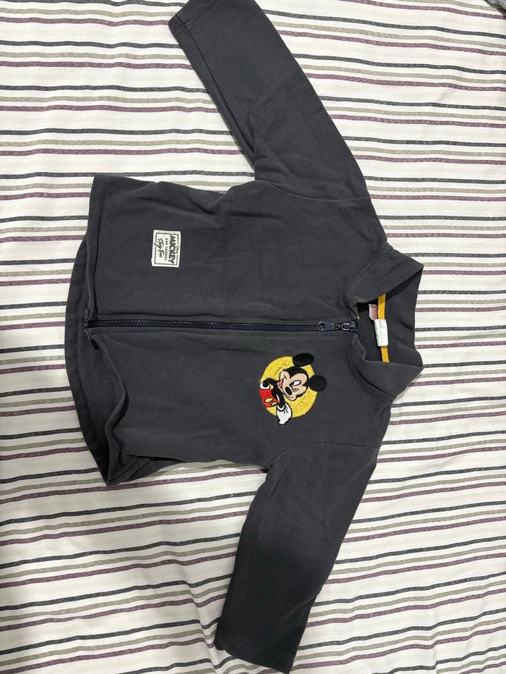 Fermuarlı, boğazlı ve uzun kollu, yumuşak tüylü kumaştan yapılmış, gri renkli, baskılı Mickey Mouse desenli, erkek çocuklar için dar kesim sweatshirt.