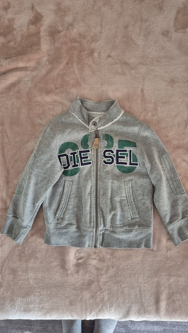 Gri renkli, fermuarlı ve rahat kesimli erkek çocuk sweatshirtü. Yumuşak ve sıcak kumaştan üretilmiş, bisiklet yaka ve baskılı "DIESEL" yazısı bulunur. 3-4yaş