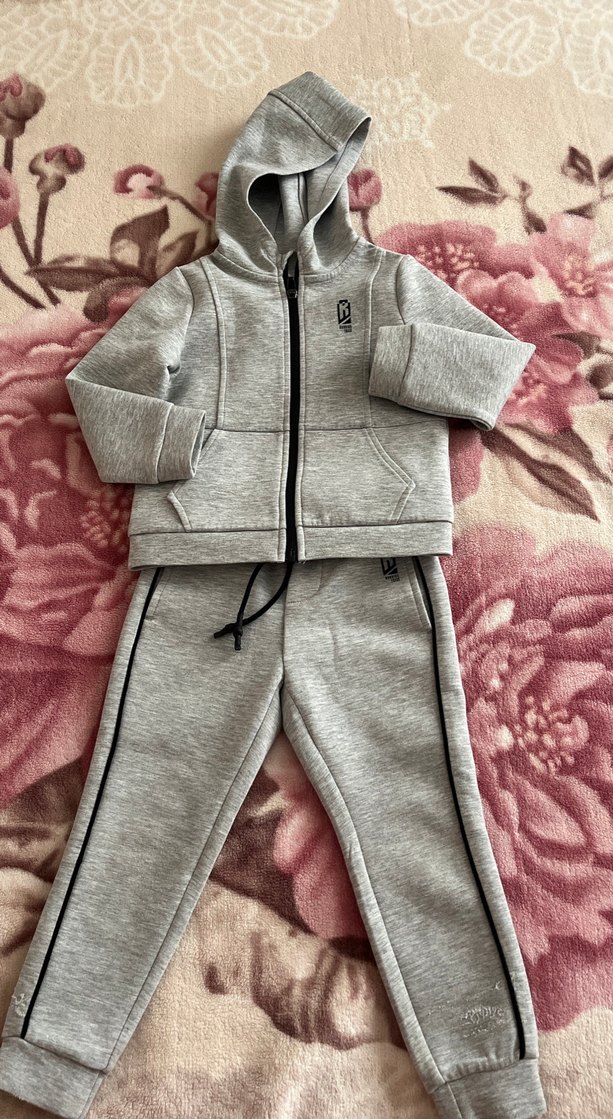 Gri renkli, fermuarlı ve kapüşonlu sweatshirt ile yan çizgili eşofmandan oluşan, rahat kesimli erkek çocuk takım. Yumuşak, sıcak kumaştan üretilmiştir. 97-107cm