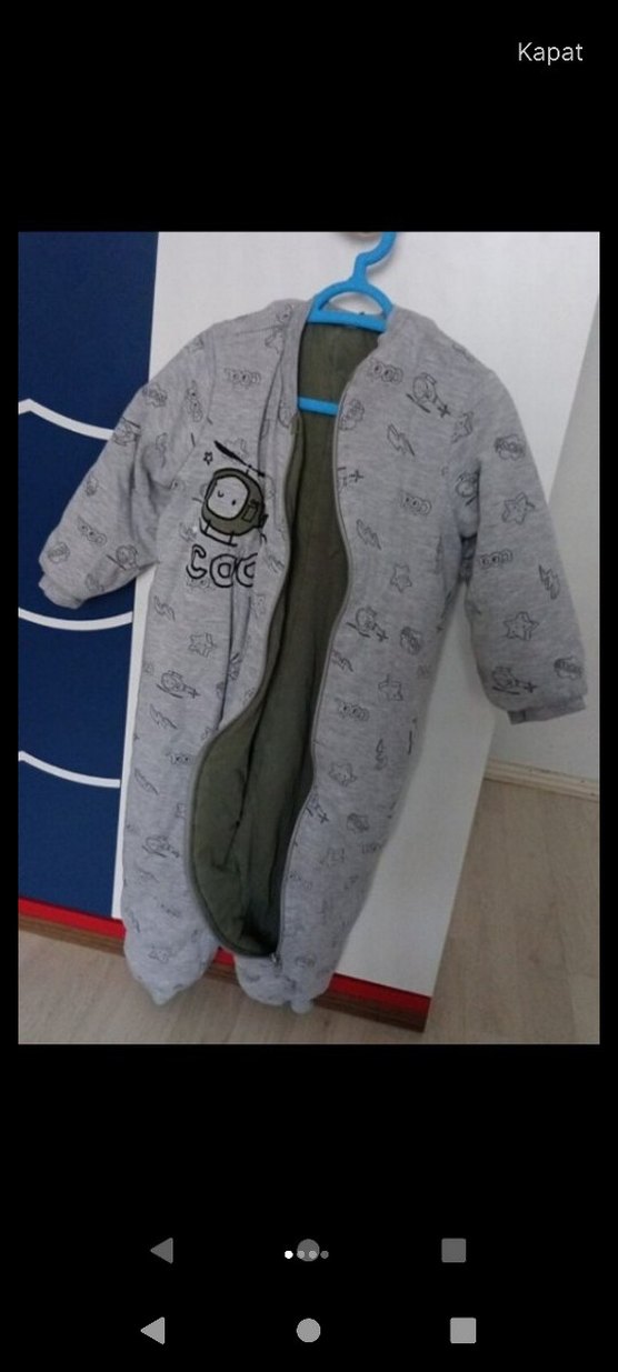 Fermuarlı, uzun kollu ve bisiklet yaka gri erkek çocuk tulumu, baskılı desenli ve içi yumuşak astarlıdır.