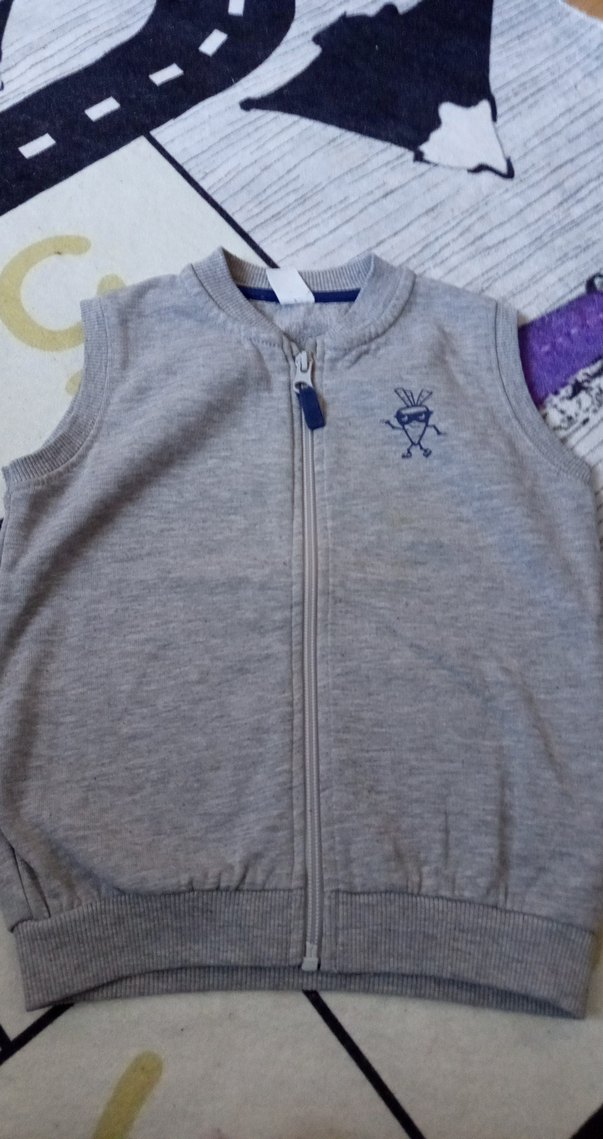 Gri renk, fermuarlı, baskılı küçük detaylı, bisiklet yaka ve kolsuz erkek çocuk yeleği. Yumuşak ve sıcak kumaştan, dar kesim.