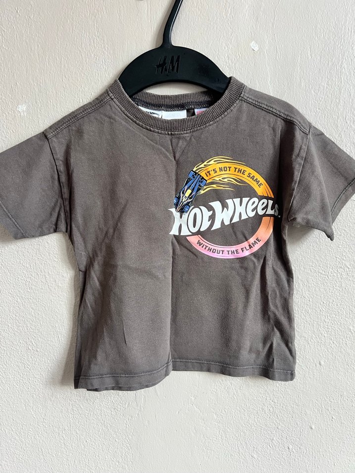 Zara marka Gri renk, kısa kollu, yuvarlak yaka, rahat kesim erkek çocuk tişörtü. Hot Wheels baskılı, cırt cırtlı detaylı, yumuşak dokulu kumaş.