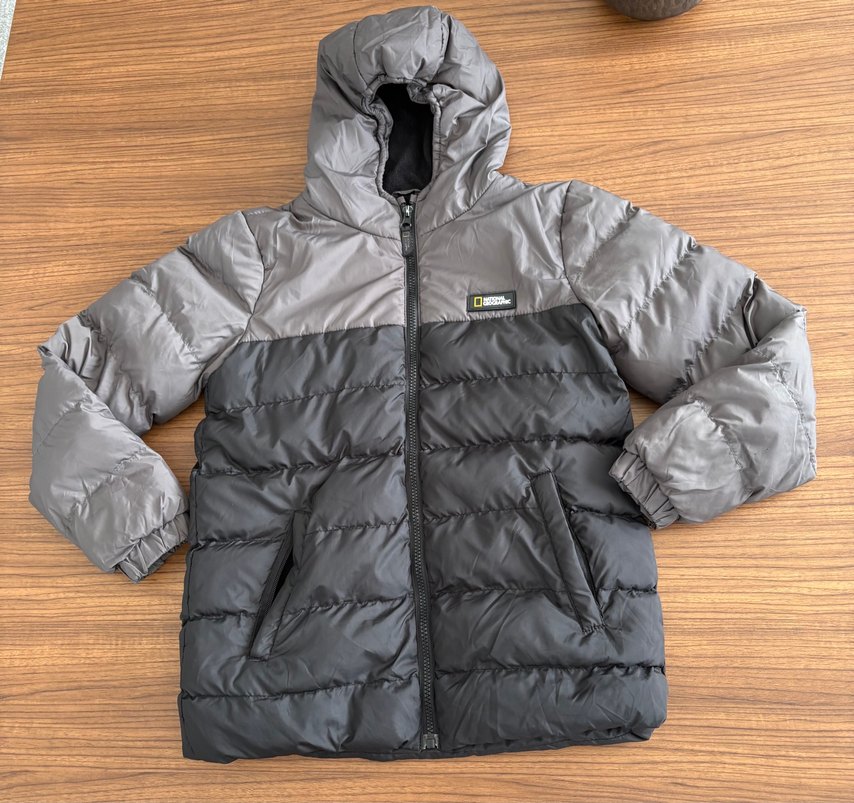 Fermuarlı ve kapüşonlu gri erkek çocuk montu, yumuşak ve sıcak kumaşa sahiptir. Az kullanılmıştır, hiçbir sorunu yoktur. #national