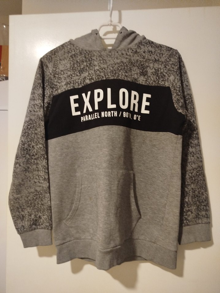 Gri renkli, uzun kollu, bisiklet yakalı erkek çocuk sweatshirtü. Rahat kesim, yumuşak dokulu ve "EXPLORE" baskılı, günlük sokak tarzına uygun.