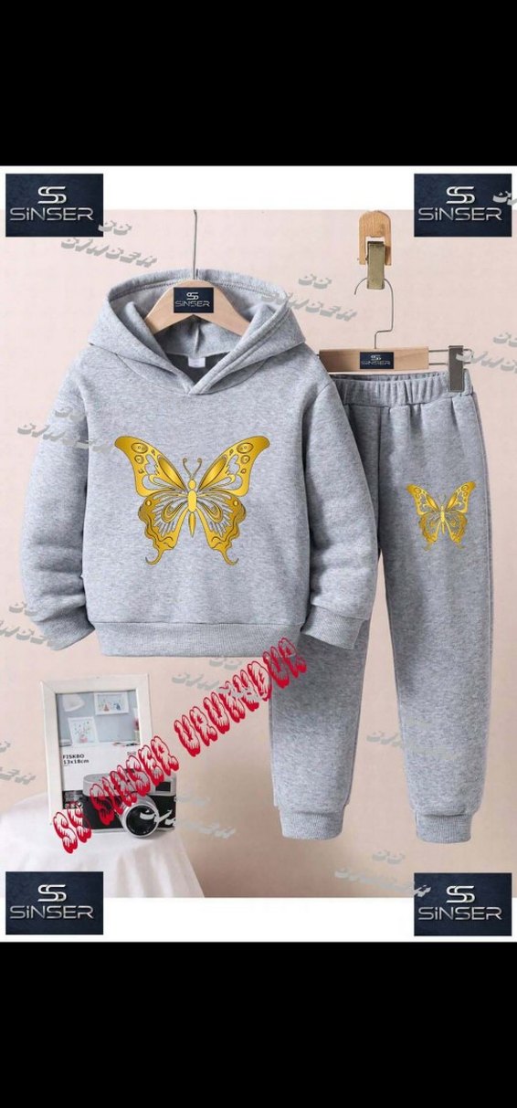 SINSER markalı gri erkek çocuk eşofman takımı, kapüşonlu ve bol kesimdir. Yumuşak kumaş üzerine işleme ve payetli sarı kelebek desenleri bulunur.