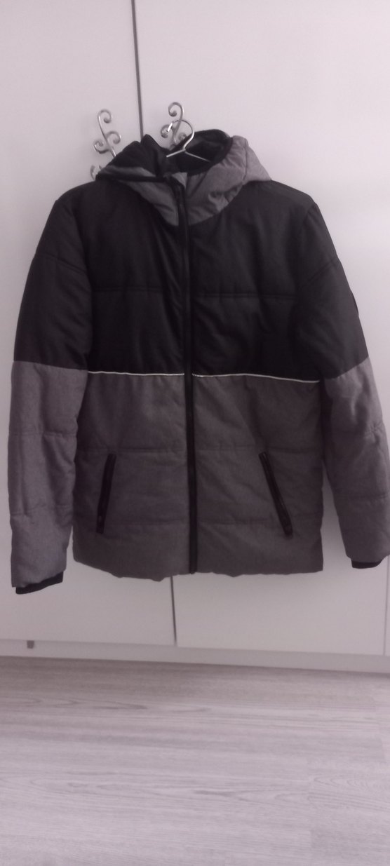 Gri tonlarında, fermuarlı ve kapisonlu kar montu Yumuşak ve sıcak kumaştan, dar kesim.yurt dışından alınmıştır