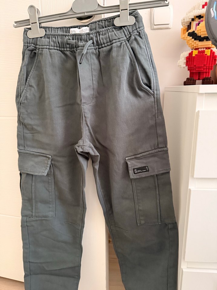 Gri denim kargo pantolon, çok cepli ve rahat bir tasarıma sahip. Hiç kullanılmadı